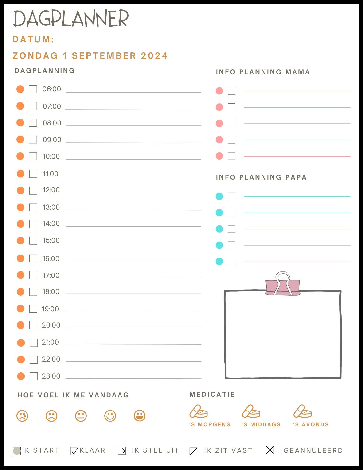 Op de dagplanner is er plaats voorzien voor de planning van uw kind, maar ook voor eventuele belangrijke zaken in mama en/ of papa's agenda die jouw kind ook aanbelangen.