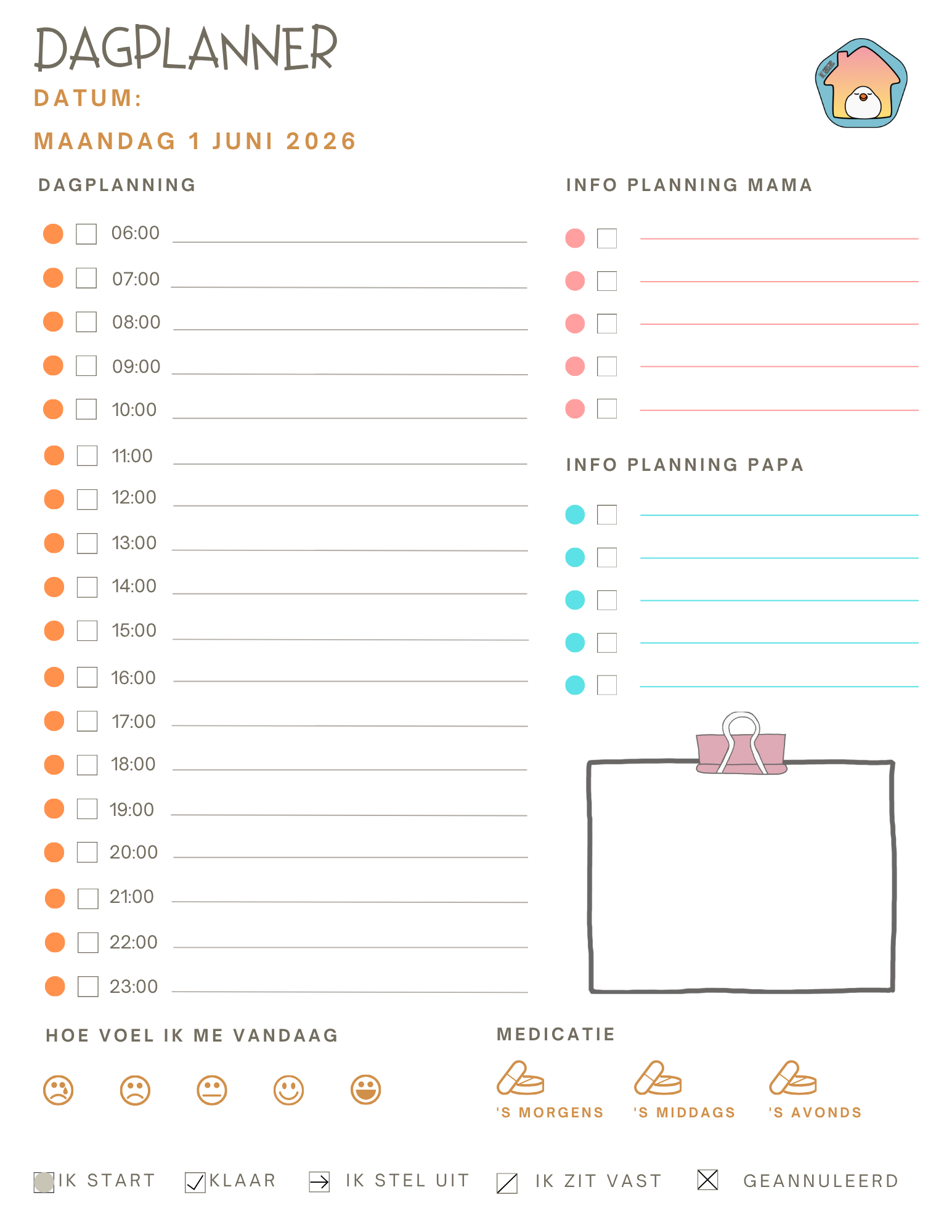 Op de dagplanner kan er ook kort een overzicht gemaakt worden van wat de ouders die dag omhanden hebben.